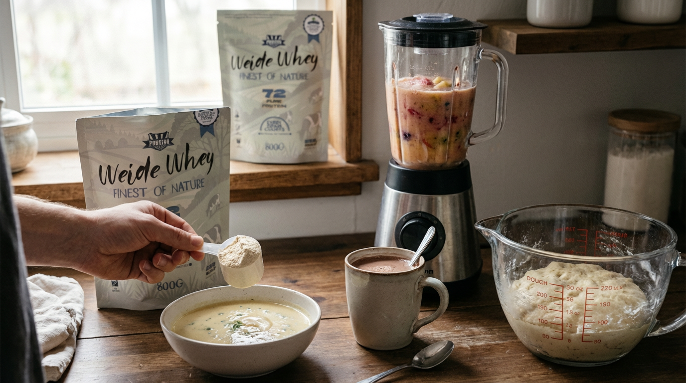 Anders als die wenigen absolut puren Molkenproteine aus nur einer Zutat, lässt es sich mit einem Stabmixer in Milch oder mit anderen Zutaten im Mixer dennoch gut zu einem Protein Shake machen.